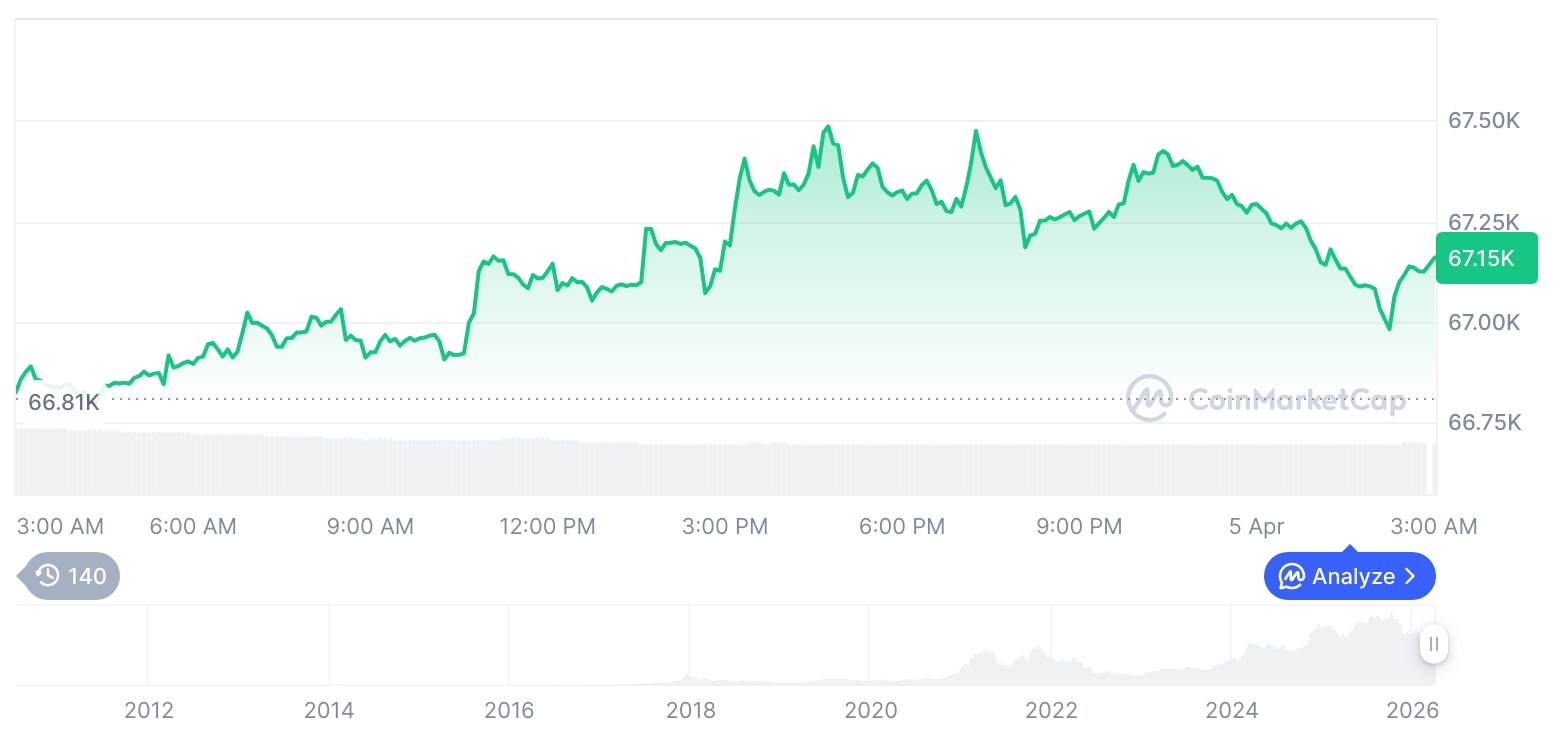 当前加密货币市场整体维持震荡态势,比特币报价为67,152美元,较前一日微幅攀升0.45%;以太坊则报2,059美元,涨幅达0.51%,显示主流公链仍具支撑力。