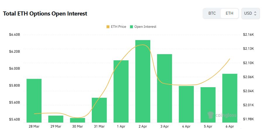 根据CoinGlass数据,截至6日上午9时,以太坊期权未平仓合约总额达59.4亿美元,较前一日的57.8亿美元增长约2.8%。在合约构成中,看涨期权占比为63.94%,看跌期权则占36.06%,显示出空头力量正在逐步积聚。