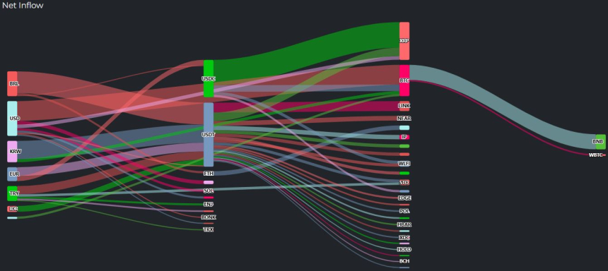 泰达币与USD Coin分别遭遇970万与570万美元的净流出,资金逐步向其他加密资产转移。其中,XRP录得570万美元流入,比特币则获得480万美元资金注入,其半数被重新配置至BNB。