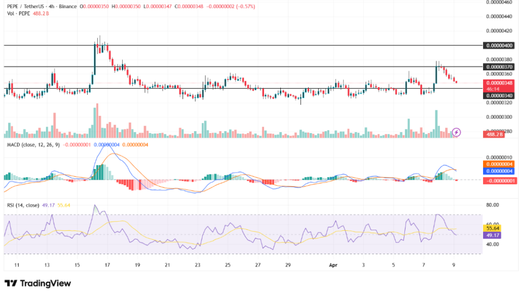 Pepe价格在早盘出现小幅回调,显示出局部卖压加剧。尽管日内维持在0.00000348美元附近,但难以突破0.00000370美元的关键阻力位,此前多次尝试均告失败。更上方的0.00000400美元区域构成更强压制,限制了上行空间。