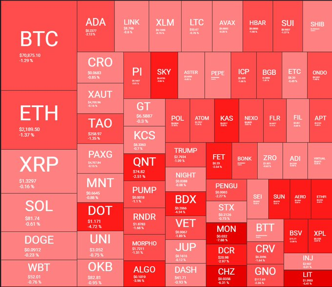 历史数据显示,在重大地缘事件冲击下,加密市场往往表现出比传统金融更剧烈的波动性。当前形势已初现端倪:比特币价格跌破71,000美元关口,以太坊亦跌穿2,200美元大关,整体市值萎缩近1%,回落至2.41万亿美元水平。